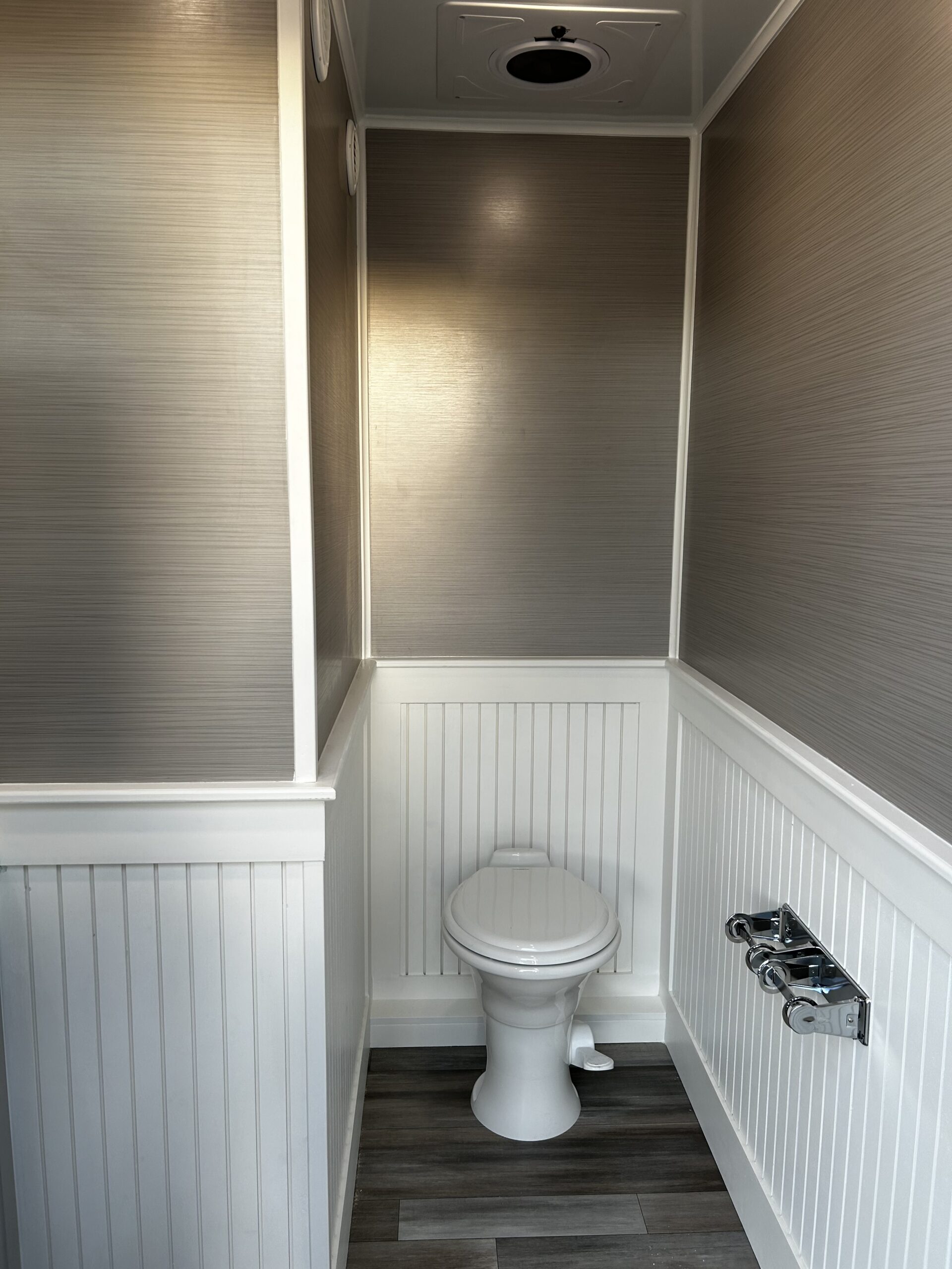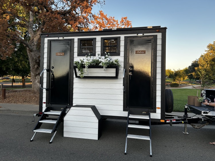 Luxury • 2-Stall Luxury restroom trailer exterior with dual doors and floral box